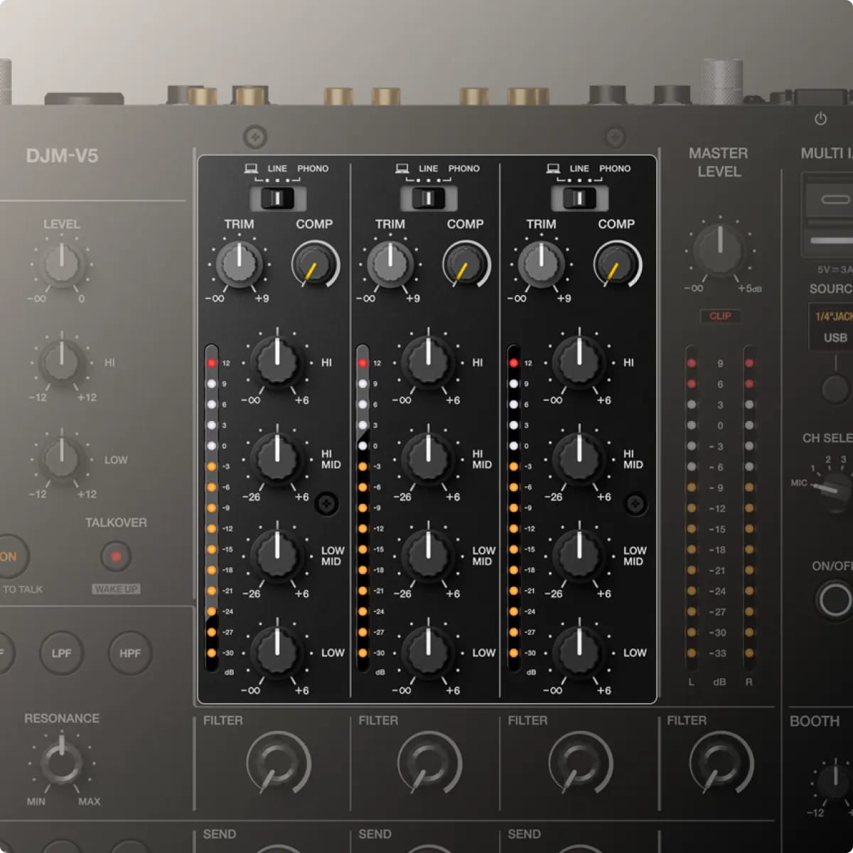 El DJM-V5 hereda muchas de las capacidades de los modelos de gama alta como el DJM-V10, pero en un formato más compacto, ocupando aproximadamente 30 % menos espacio, lo que lo hace perfecto para espacios pequeños sin sacrificar calidad ni control profesional.